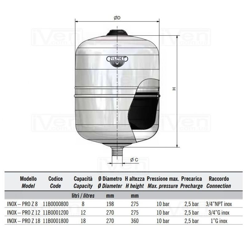 Гідроакумулятор або Розширювальний бак для води Zilmet Inox-Pro 18л (11B0001800) ємністью 18 з діаметром баку 270 мм, і висотою 360 мм, робочий тиск до 10 Бар, і діапазоном робочої температури - 10/99 ° C. Приєднання з різьбою 1". Країна виробник Італія.