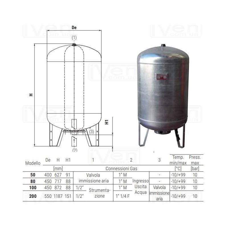 Гідроакумулюючий бак оцинкований для питної води вертикальний на 100 л з підключенням 1 "дюйм, має EPDM мембрану. Розміри діаметр 450мм, висота 872 мм, робочий тиск до 10 bar. Вертикальний сталевий оцинкований гідроакумулятор Cordivari Zincato PED VT для питної води. В першу чергу призначений для очищеної підготовленої води для пиття.