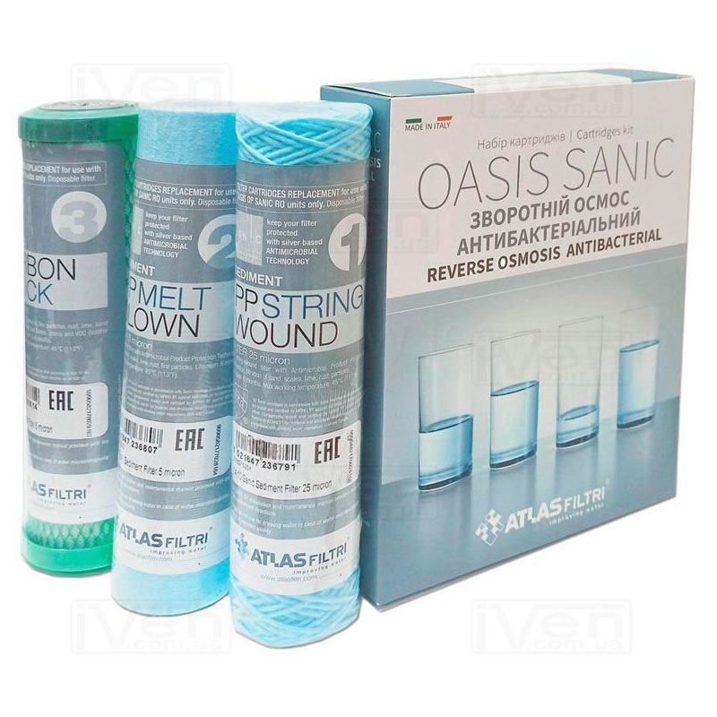 Інформація Набір картриджів для систем зворотного осмосу NEW! Atlas Filtri OASIS DP SANIC (FA SANIC+CPP SANIC+CB VOC) (LSP000005)