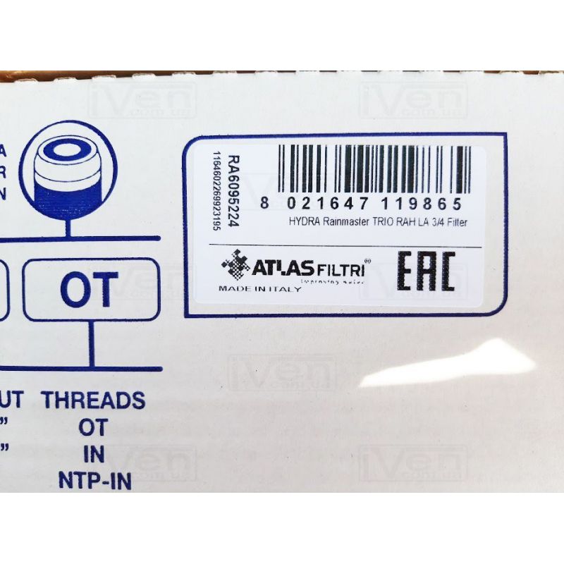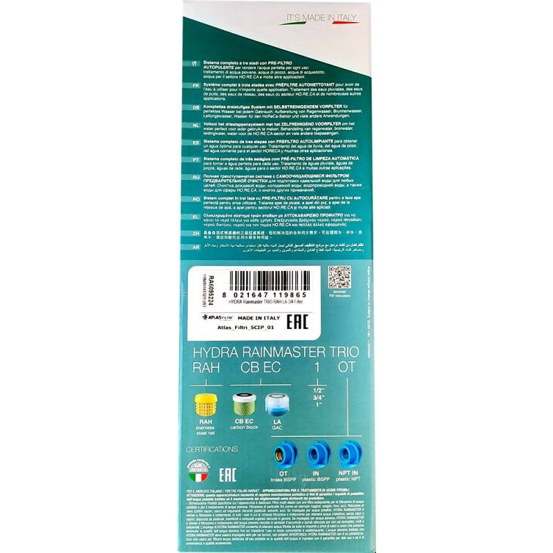 Інформація Фільтр Atlas Filtri HYDRA RAINMASTER TRIO Ø3/4" (латунь) + картриджи RAH, FA, LA 45°C 8 bar KIT (RA6095224)