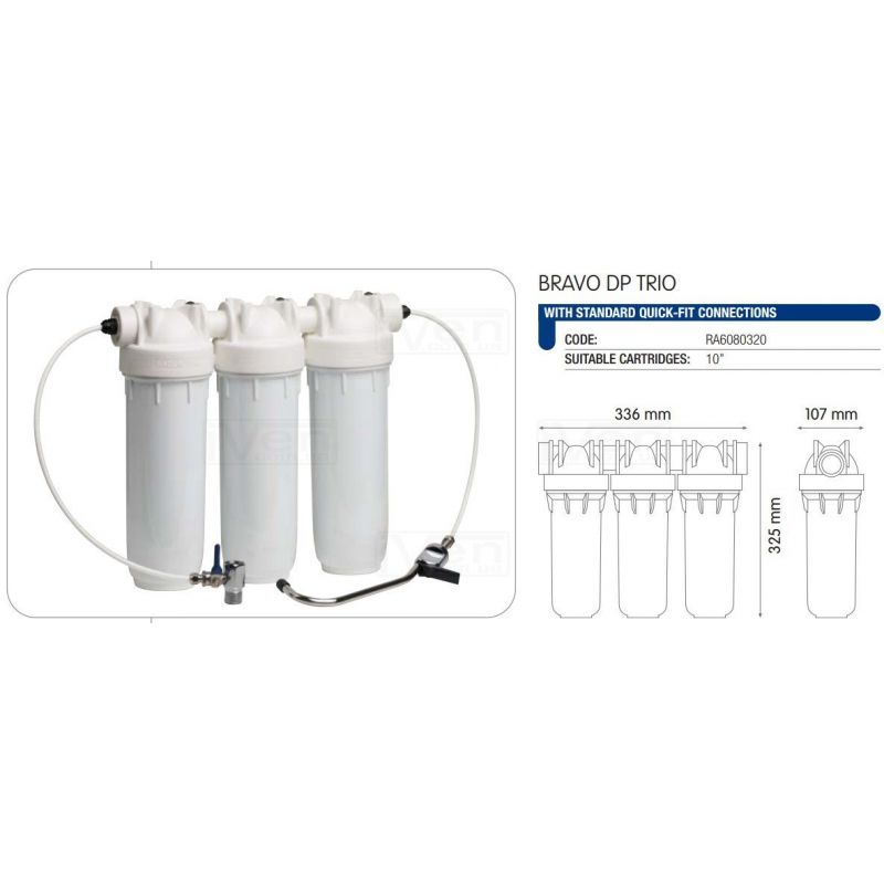 Запатентована установка під мийку BRAVO DP TRIO для ступенчістой очищення води для пиття. Комплект Atlas Filtri BRAVO DP TRIO має компактний розмір для монтажу під мийку. Принцип роботи полягає в поступові очищення води для пиття. У комплект входить корпус з трьох колб з кріпленням на стіну, шурупи, ключ, швидкоз'ємні з'єднання (для зручності монтажу), спеціальне центрирующее пристрій для картриджів SX, фірмовий кран для відводу очищеної води, ключ і запірний кран трійник, для підключення до водопостачання. Рекомендується встановлювати спеціальний комплект фільтрів ЗО OASIS DP або з іонами срібла DP Sanic.
