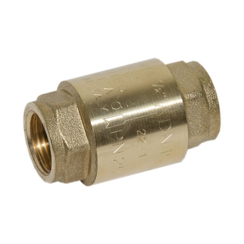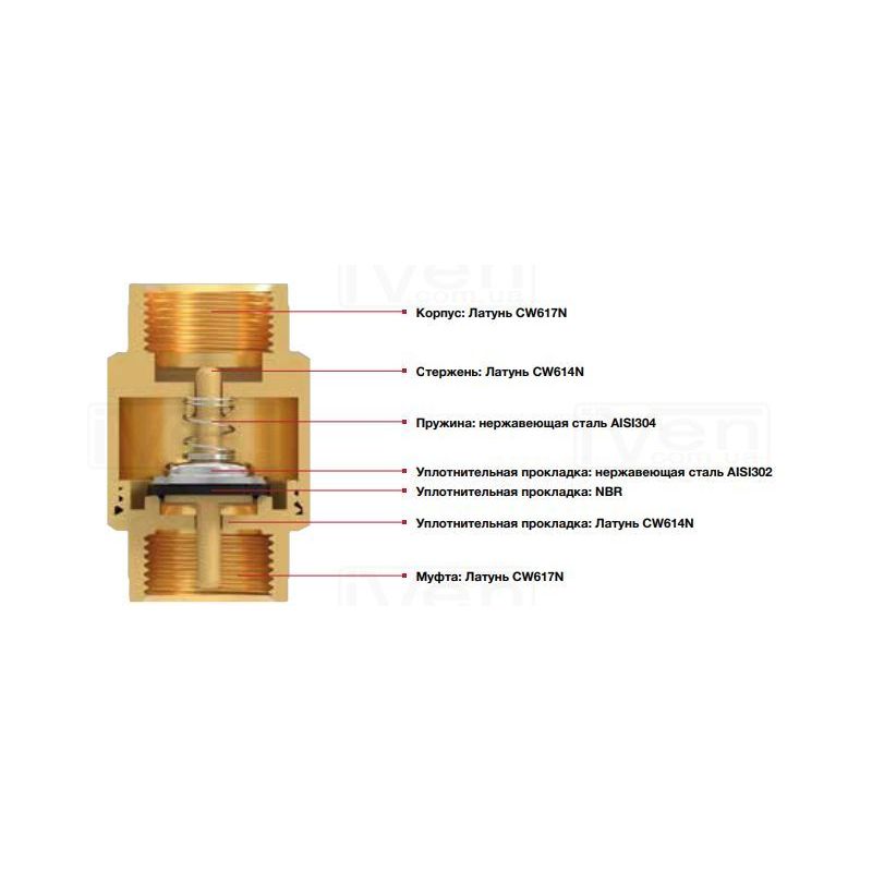 Зворотний клапан з латунним штоком. Застосовується для запобігання потоку води в трубопроводі в зворотну сторону. Можливо встановити в будь-якому положенні. Встановлюється в опалення, водопостачання. Напрямок води зазначено стрілкою на корпусі. Відмінно застосовується в системах санітарного водопостачання, промисловості, сільському господарстві і в секторі пневматики. Герметичність сідла забезпечує прокладка з NBR.