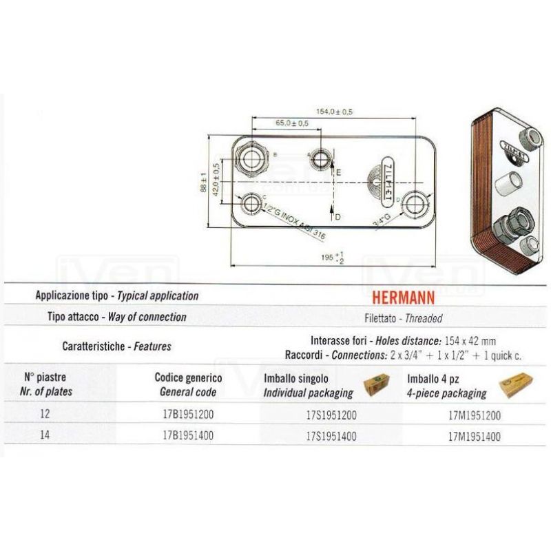 Пластинчастий вторинний теплообмінник Zilmet ZB 195 на 14 пластин (17B1951400) Виготовлений з нержавіючої сталі AISI 316 і 99,9% мідним припоєм. Сумісність для котлів Fondital Pictor, Viessmann WH1B, Zoom, Rocterm, Nobel, Ariston Uno, Beretta, Elexia, Solly, Termal, Rens, Biasi. Виготовлено в Італії.