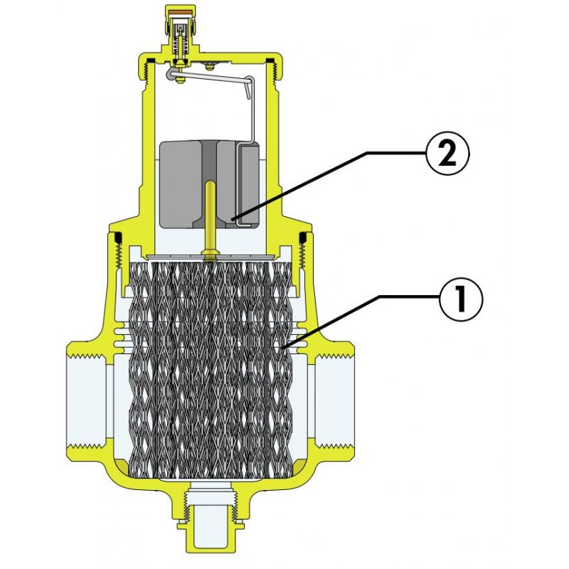 Деаератор використовує спільну дію кількох фізичні принципи. Активний частина складається з набору концентрическая металева сітка поверхні (1). Ці елементи створити вихровий рух потрібно для полегшення випуск мікропухирців і їх адгезія до поверхонь. Бульбашки, зливаючись з кожним Інше, збільшення обсягу до гідростатична тяга досить, щоб подолати силу адгезії до конструкції. Oни потім підніміться до верхньої частини пристрою і виштовхуйте через поплавковий автоматичний (2). Він розроблений таким так, що напрямок, в якому середовище тече всередині нього не має значення.