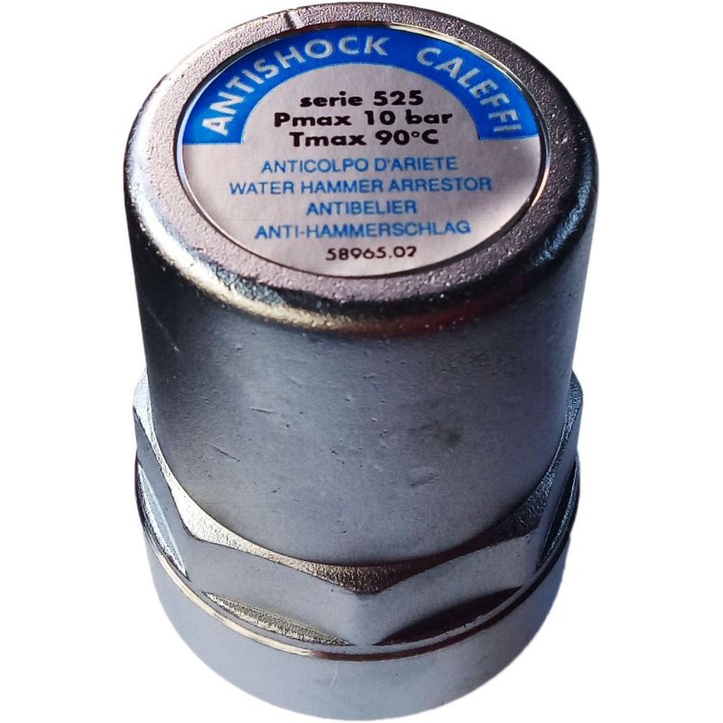 Caleffi ANTISHOCK (525040) - Амортизатор гідравлічного удару з хромованого латунного корпусу. Працює при тиску до 10 бар і з максимальною робочою температурою 90 ° С (підходить для гарячої води в тому числі). Є ущільнювача ПТФЕ на різьбі кільце.