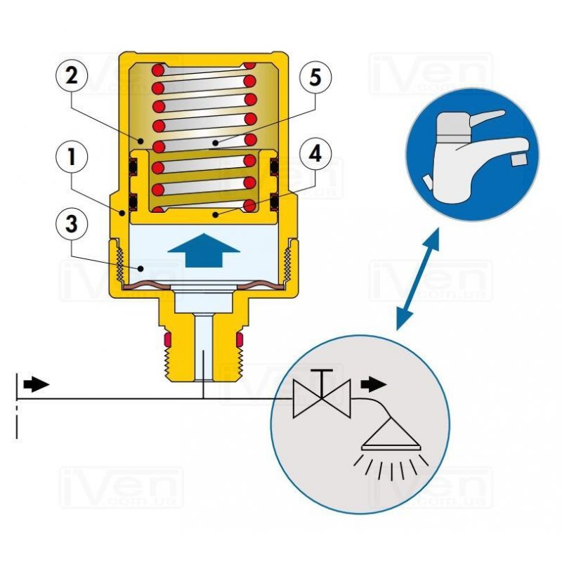 Принцип роботи Caleffi ANTISHOCK (525040): Амортизатор гідравлічного удару Калеффі серії 525 складається з циліндра (1), розділеного на дві камери (2) і (3) поршнем з подвійним кільцем ущільнювача (4). Закрита камера (2) містить повітря і є амортизатором, використовуючи стисливість повітря. Відкрита камера (3) з'єднується безпосередньо з трубопроводом і заповнюється водою системи. Поштовх води на поршень балансується як зміною тиску води, що міститься в камері (2), так і контрастною пружиною (5), розташованої ззаду поршня в повітряній камері. Запис осцилографа збоку виявляє такі аспекти: - швидкість збільшення тиску - коливальний характер явища - тривалість підвищеного тиску в трубопроводі також після впливу гідравлічного удару - ефективність амортизатора.