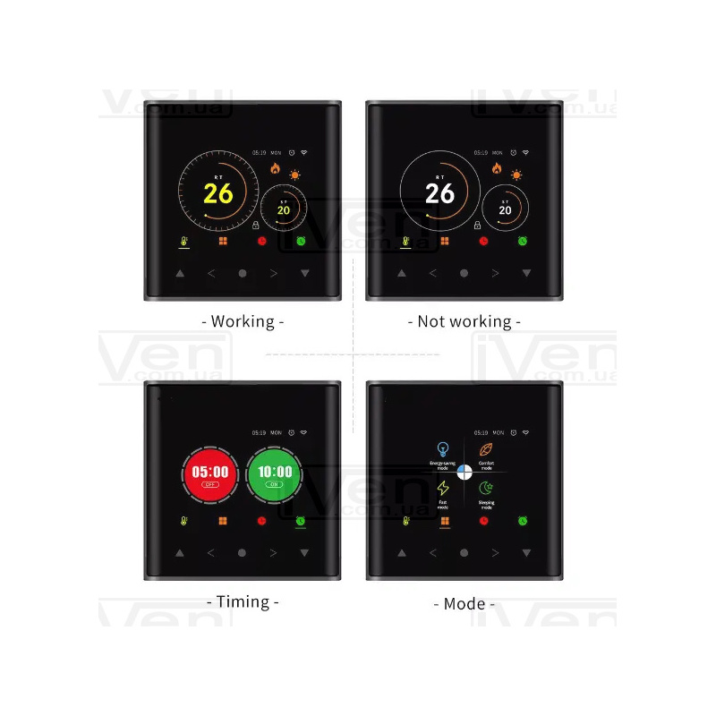 Сенсорний кольоровий дисплей забезпечує зручне налаштування температури підлоги й повітря, а також вибір часу роботи.