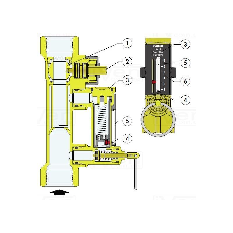 Шар (4), который указывает расход не находится в непосредственном контакте с теплоносителем, который протекает в измерителе расхода. Благодаря эффективной и инновационной системе измерения, шар перемещается в цилиндре (5), отделенном от корпуса измерителя расхода. Шар притягивает магнит (6), который, в свою очередь, прочно соединен с поплавком (7). Это благоприятствует тому, что система индикации расхода всегда остается чистой и, поэтому, надежной во времени, касательно приводимых значений.