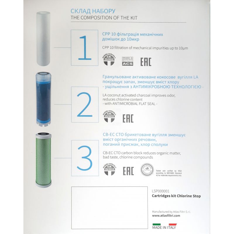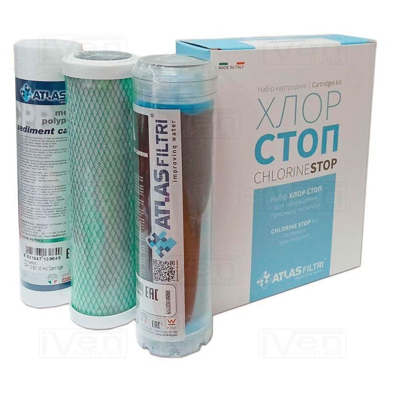 Комплект картриджей для тройной системы фильтрации для снижения содержании хлора в воде Atlas Filtri ХЛОР СТОП (ClorineStop). Состоит из трех ступеней: 1. CPP 10 микрон, для удаления механических примесей. 2. LA Активированный гранулированный кокосовый уголь, удаляет запах, уменьшает содержание хлора. 3. CB-ECCTOБрикетированной уголь уменьшает содержание органичных соединений, убирает плохой привкус воды, хлор соединения.