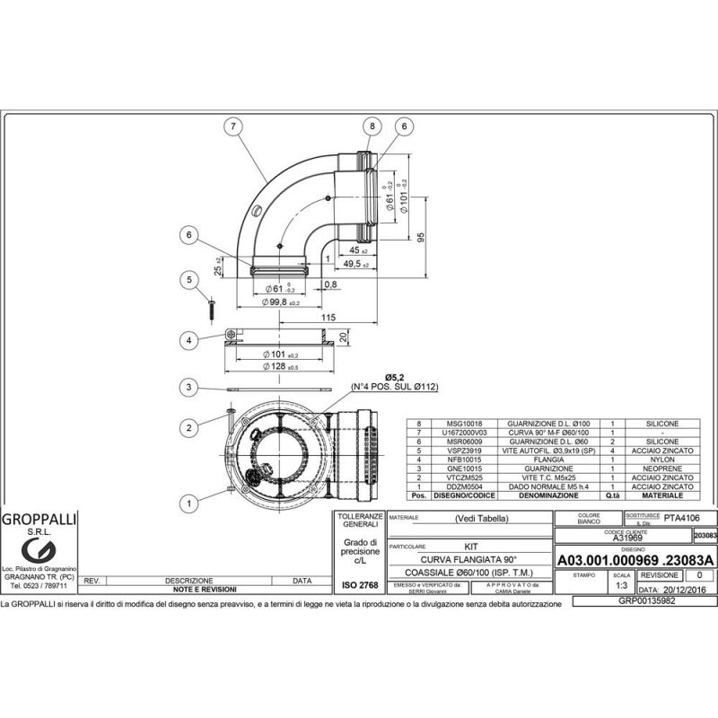 коаксиальный колено с фланцем для традиционных котлов d60/100 mm 90 ° с отверстием для теста GROPPALLI S.R.L. (A31969) изготовлен с Итальяныским качеством и в соответствии сертификации ISO 9001:2015.