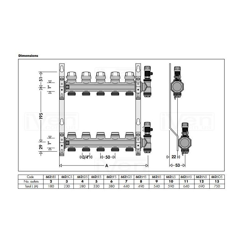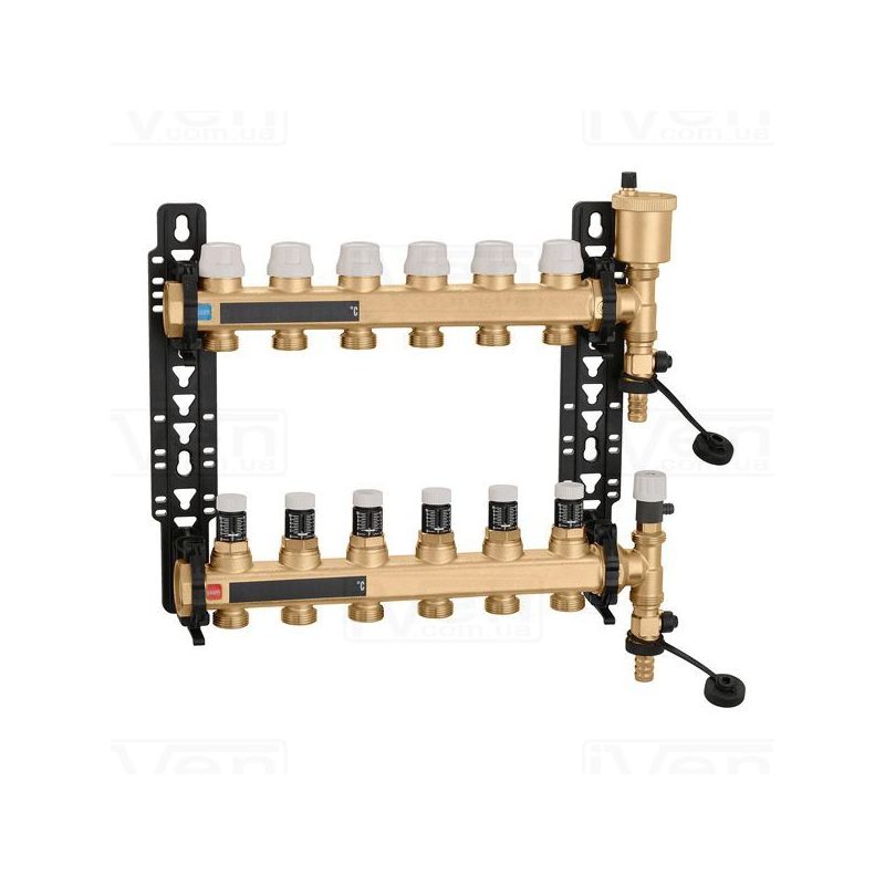 Caleffi латунный коллектор для теплого пола (и не только) в сборе (6626F6), в боре с расходометром, и клапанами для термоголовок и сервоприводов (микрометрические клапаны предварительной настройки). Имеет входное присоединение 1” и 6 пар выходов под трубу с соединением 3/4”. Комплектуется вместе с автоматическими воздухотводчиками и сливным краном, а так же крепление для шкафов или настенной установки. Межосевое расстояние выходов 50мм.