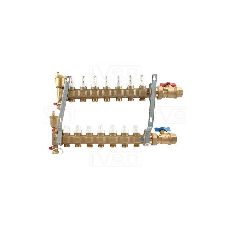 Коллекторная группа Caleffi латунный 1"x3/4" на 7 контуров в сборе (6686G5S1) со встроенным датчиком расхода и балансировочным клапаном. Изготовлен из сплава латунь. Рабочий диапазон давления до 10 бар, и температуры от 0 до 80°C. Страна производитель Италия.