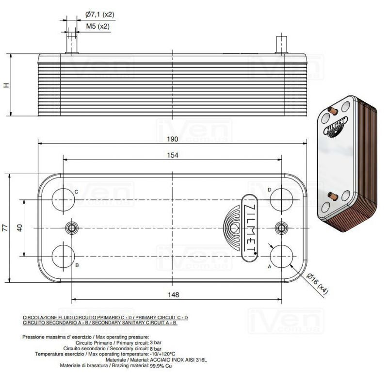 Пластинчатый вторичный теплообменник Zilmet ZB 190 на 12 пластин (17B1901218) Изготовлен из нержавеющей стали AISI 316 и 99,9% медным припоем. Совместимость для котлов Fondital Pictor, Viessmann WH1B, Zoom, Rocterm, Nobel, Ariston Uno, Beretta, Elexia, Solly, Termal, Rens, Biasi. Изготовлено в Италии.