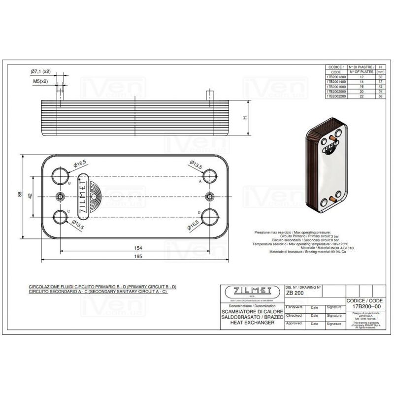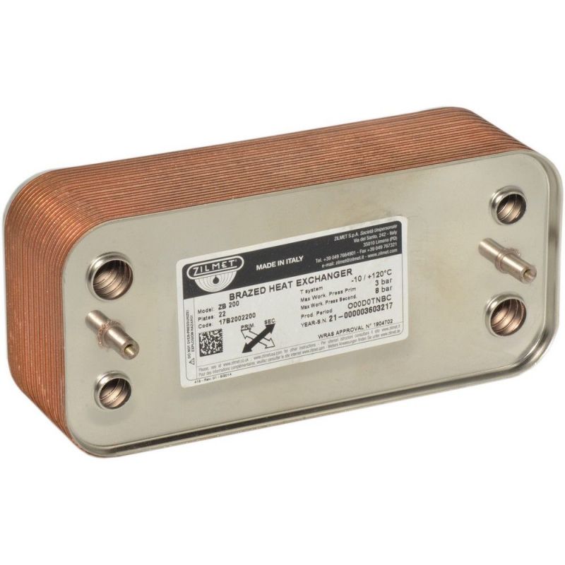 Пластинчатый вторичный теплообменник Zilmet ZB 200 на 22 пластин (17B2002200) Изготовлен из нержавеющей стали AISI 316 и 99,9% медным припоем. Совместимость для котлов Fondital Pictor, Viessmann WH1B, Zoom, Rocterm, Nobel, Ariston Uno, Beretta, Elexia, Solly, Termal, Rens, Biasi. Изготовлено в Италии.