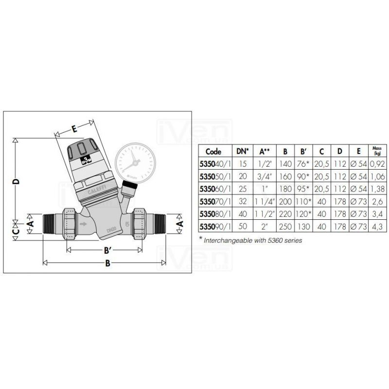 Размеры редуктора давления CALEFFI со шкалой латунь (5350)