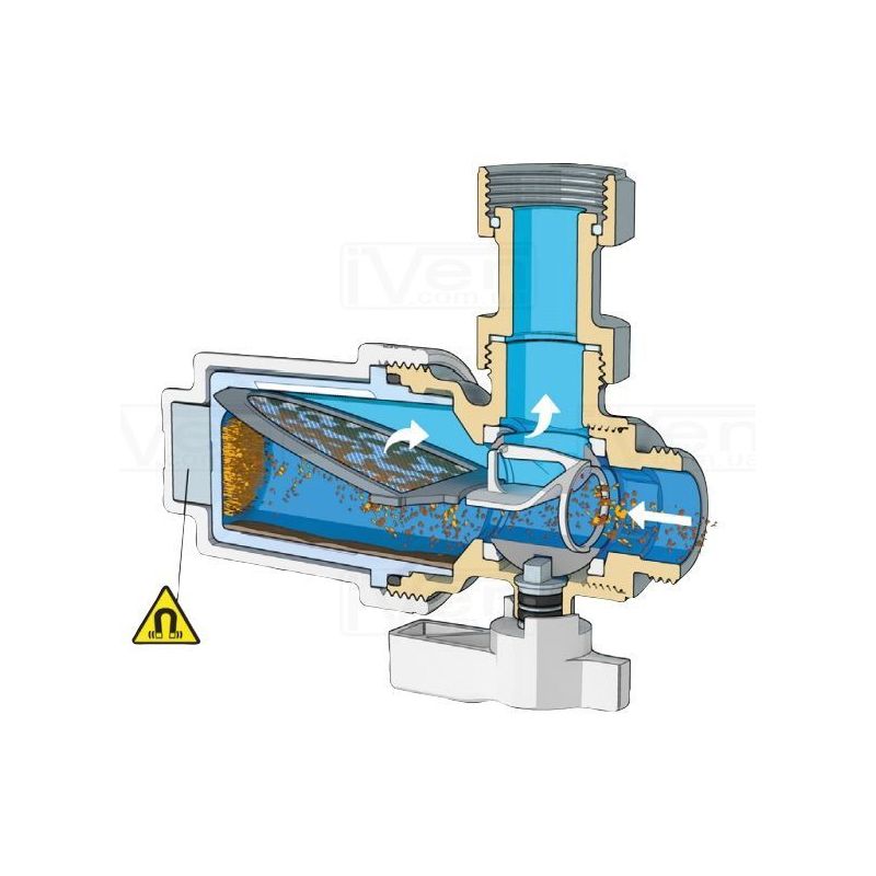 Магнитный фильтр для механической фильтрации, со степенью 800 μm. Удаляет примеси в системах отопления и кондиционирования с помощью сетчатой сетки и неодимовым магнитом в камере для сбора тяжелых частиц. Сама колба прозрачная, что позволяет следить за количеством излишек и вовремя обслужить систему. Малые габариты не забирает много места.