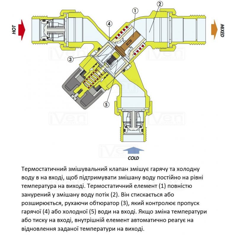 В случае аварийного отключения подачи холодной воды запорный механизм перекрывает проход горячей воды, предотвращая подачу смешанная вода. Это гарантируется только при минимальном разность температур поступающей горячей воды и смешанной подача воды 15 ° C.
