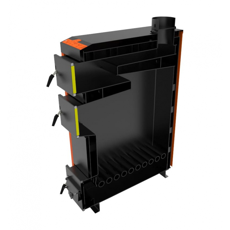 Водоохолоджувальні колосники з цільностягнутої труби та 2-х ходовий пенальний теплообмінник, а в котлах від 40 кВт 3-х ходовий - дозволяє максимально збільшити корисну площу зняття тепла, а також зручно чиститься через верхні ревізійні дверцята.
