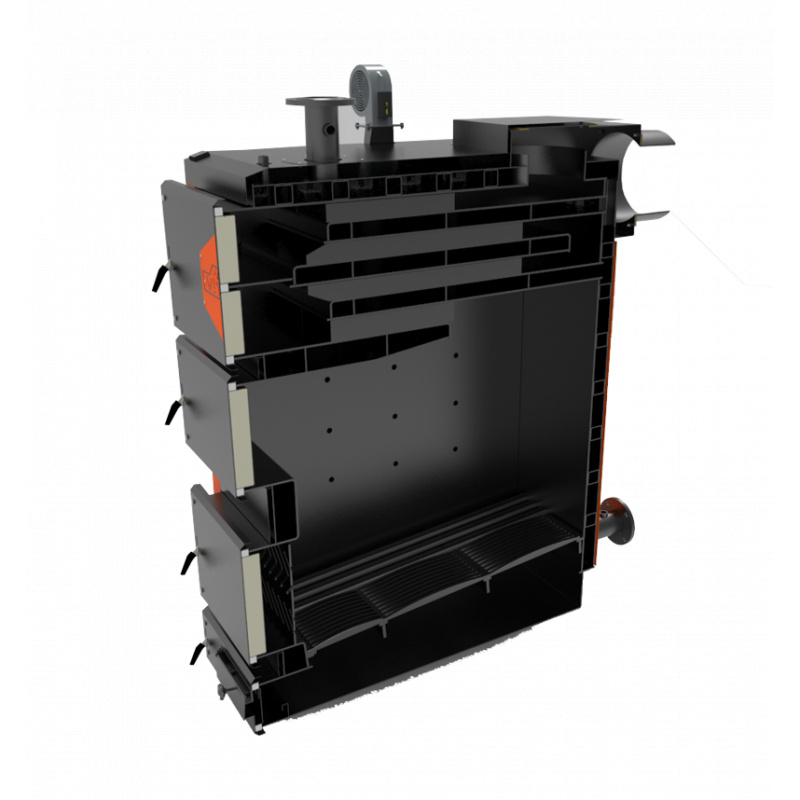 Чотириходовий теплообмінник пенального типу дозволяє максимально збільшити корисну площу зняття тепла, а також зручно чиститься через верхні ревізійні дверцята.