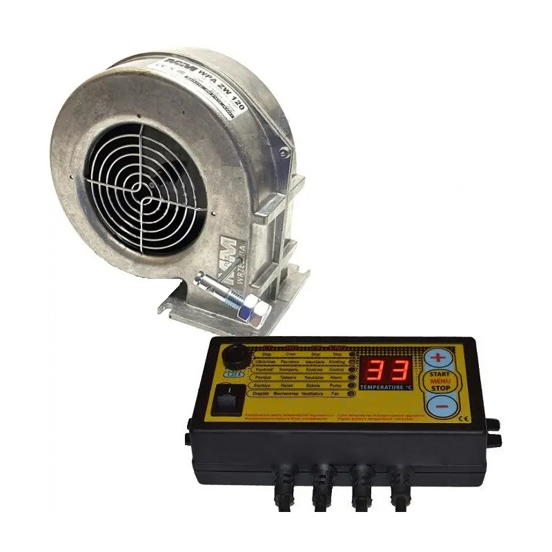 В комплект входить турбіна для твердопаливних котлів і автоматичний регулятор. Регулятор температури підходить для твердопаливних котлів будь-якого виробника. Він контролює роботу насоса циркуляції води та продув (турбіни). Коли температура котла нижча за задану, регулятор працює в режимі, де продув постійно активний, якщо ввімкнений режим розпалу. Якщо температура котла перевищує задану, регулятор переходить у режим підтримки. При зниженні температури котла нижче +5 °C, регулятор примусово вмикає насос центрального опалення, запобігаючи замерзанню теплоносія в системі.