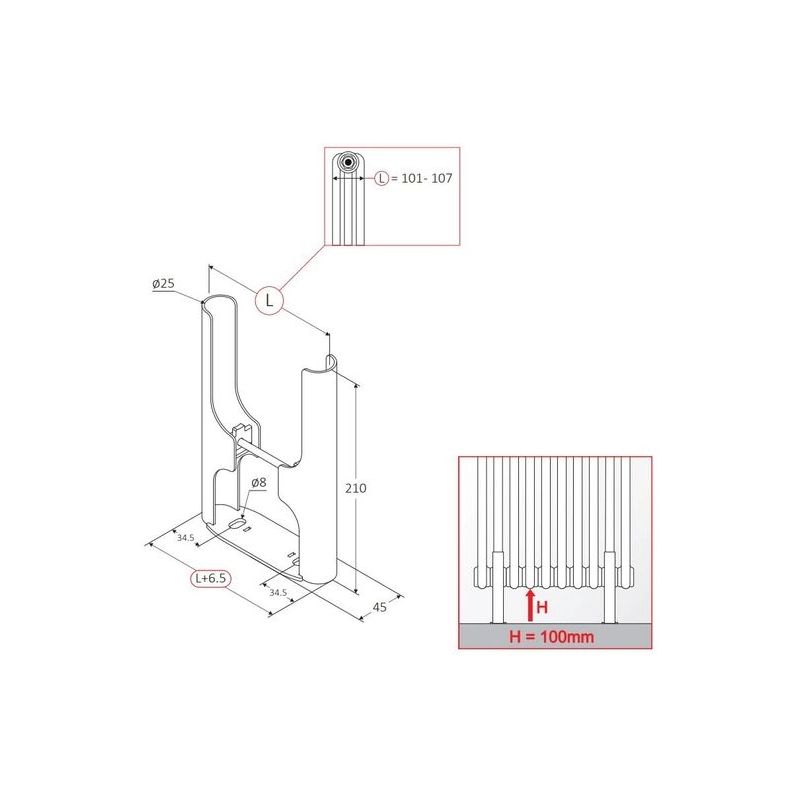 Інформація Комплект підлогових кронштейнів (2 шт.) для триколоних (глибина 107 мм.) трубчатих радіаторів MB Fix PGE RAL9010 (60770107)