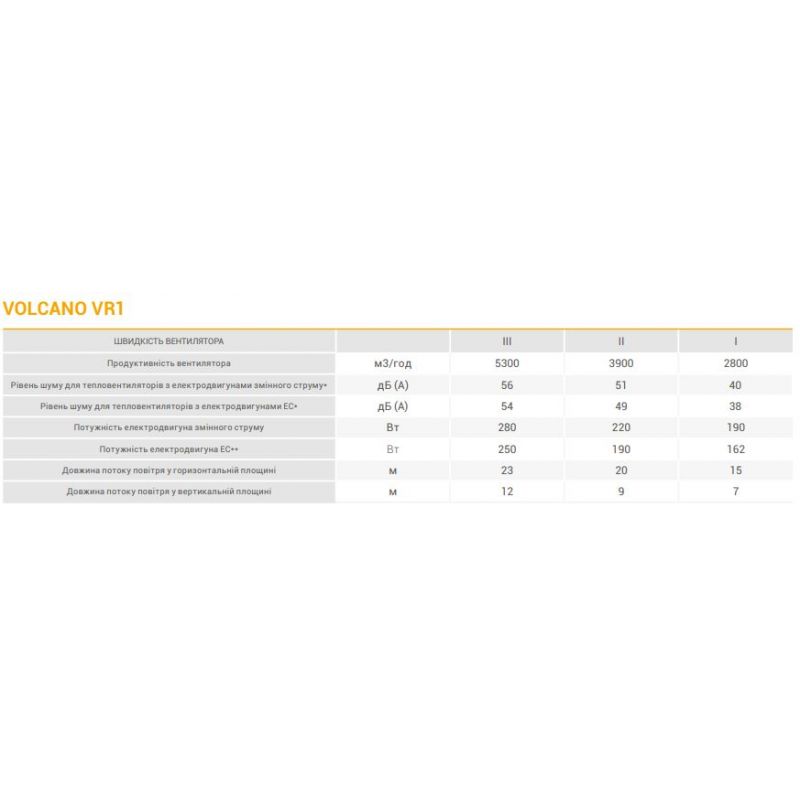 Водяний тепловентилятор VTS VOLCANO VR1 ЕС (1-4-0101-0442) з ЕС двигуном та діапазоном потужності від 5 до 30 кВт для передачі тепла в приміщені по повітрю довжина горизонтального та вертикального струменя повітря 23 і 12 метрів відповідно. Діаметр приєднувальних патрубків 3/4", Маса тепловентилятора (без води) з двигуном AC 21 кг. Напруга живлення В/Гц 230/50. Ступінь захисту електродвигуна ЕС IP 44.