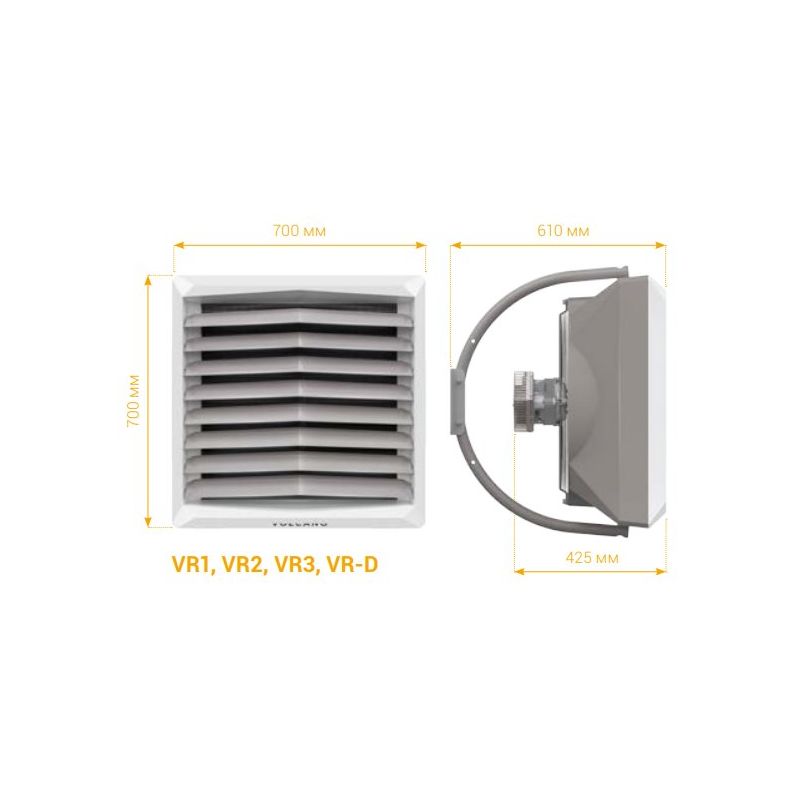 Водяний тепловентилятор VTS VOLCANO VR3 ЕС (1-4-0101-0444) з AC двигуном, з 3 теплообмінниками та діапазоном потужності від 13 до 75 кВт для передачі тепла в приміщені по повітрю довжина горизонтального та вертикального струменя повітря 25 і 12 метрів відповідно. Діаметр приєднувальних патрубків 3/4", Маса тепловентилятора (без води) з двигуном AC 24,5 кг. Напруга живлення В/Гц 230/50. Ступінь захисту електродвигуна AC IP 44.