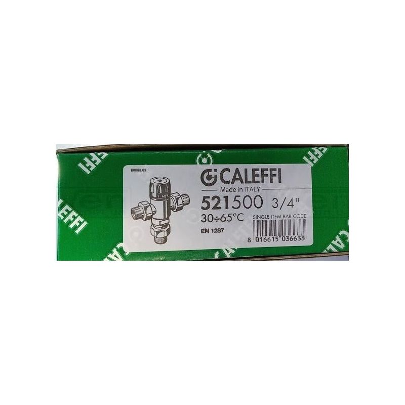 Caleffi 521500 Змішувач-термостат d3/4" з налаштуванням 30-65 °C Kv = 2,6 (m3/h) Термостатичний змішувач проти накипу, регульований. Приєднання: G 1/2" A (ISO 228-1) M, накидна гайка. Максимальний робочий тиск: 14 бар. Діапазон температури рідини: 2–85 °C. Діапазон регулювання температури: 30–65 °C. Покриття: хромоване. Kv: 2,6 м³/год. Матеріал: латунь, стійка до знецинкування, DR "з низьким вмістом свинцю".