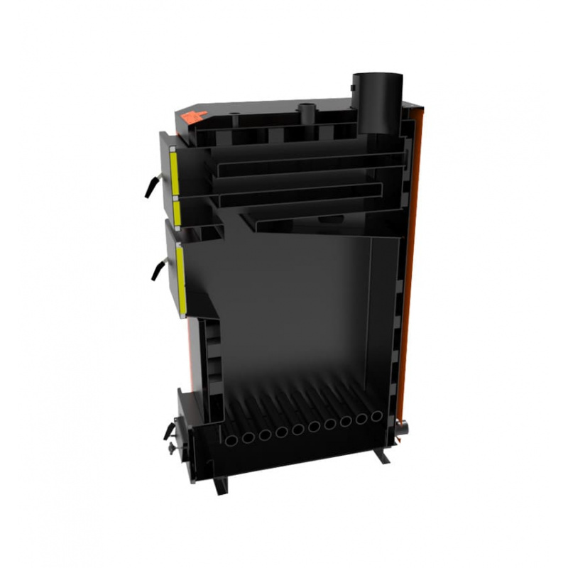 Водоохолоджувальні колосники з цільностягнутої труби та 2-х ходовий пенальний теплообмінник, а в котлах від 40 кВт 3-х ходовий - дозволяє максимально збільшити корисну площу зняття тепла, а також зручно чиститься через верхні ревізійні дверцята. Найбільша камера згоряння (топка) на ринку України в цьому класі