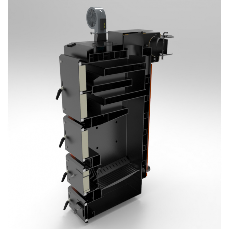 Чотириходовий теплообмінник пенального типу дозволяє максимально збільшити корисну площу зняття тепла, а також зручно чиститься через верхні ревізійні дверцята.