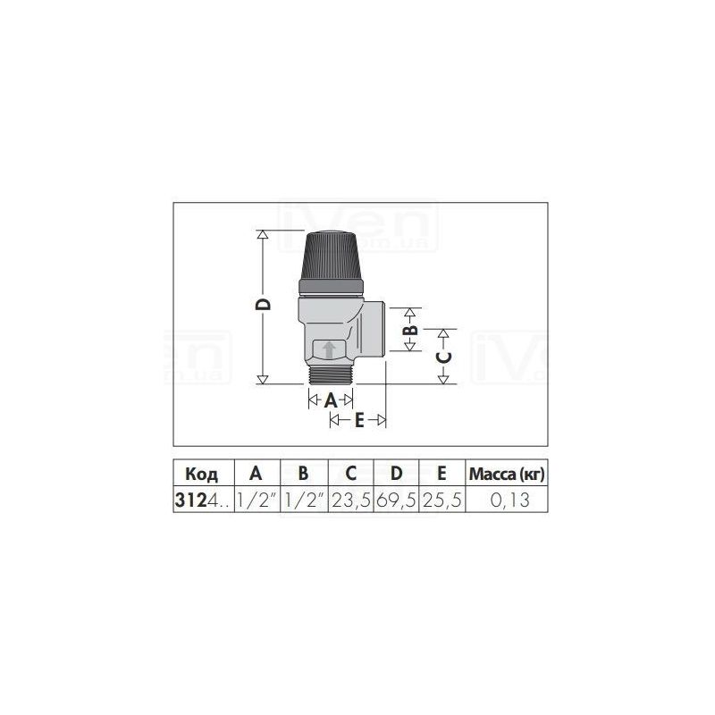 Мембранний запобіжний клапан Caleffi 312460 з внутрішнім різьбленням на висновок і вхід зовнішня 1/2 дюйма. Тиск калібрування 6 бар. Надмірний тиск при спрацьовуванні: 7,2 бар. Закриває диференціал 4,8 бар. Країна виробник Італія.